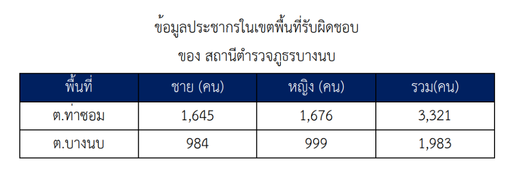 สถานีตำรวจภูธรบางนบ รับผิดชอบพื้นที่ 2 ตำบล มีจำนวนประชากร ในเขตพื้นที่รับผิดชอบ ดังนี้