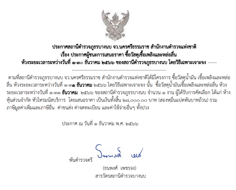 ประกาศผู้ชนะการเสนอราคา ซื้อวัสดุเชื้อเพลิงและหล่อลื่น ห้วงระยะเวลาระหว่างวันที่ 1-31 ธันวาคม 2566 ของสถานีตำรวจภูธรบางนบ