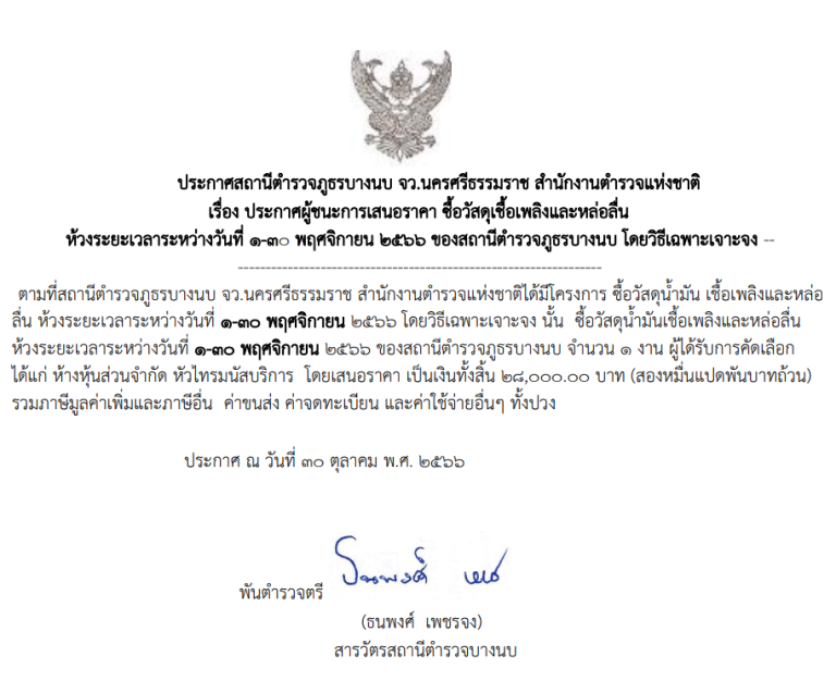 ประกาศผู้ชนะการเสนอราคา ซื้อวัสดุเชื้อเพลิงและหล่อลื่น ห้วงระยะเวลาระหว่างวันที่ 1-30 พฤศจิกายน 2566 ของสถานีตำรวจภูธรบางนบ